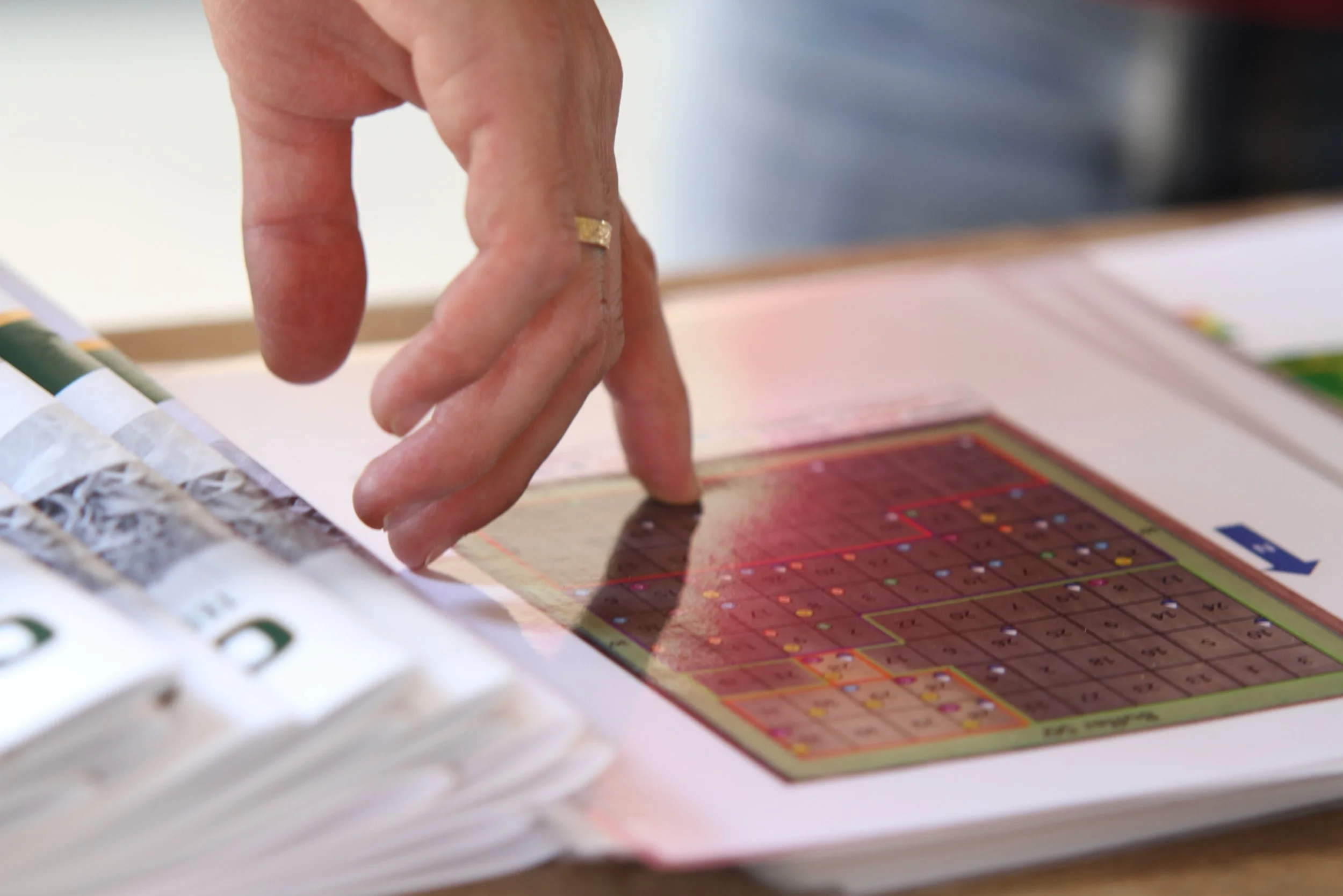 A competitor points to a plot on a CSU-TAPS field layout, showing mini “farms” on a single competition field. The abundance of farm management decision-making data generated by a single TAPS competition makes the format ideal for research in linking precision agriculture strategies and input use efficiency with maintaining farm productivity and profitability. (Photo by Christine Hamilton)